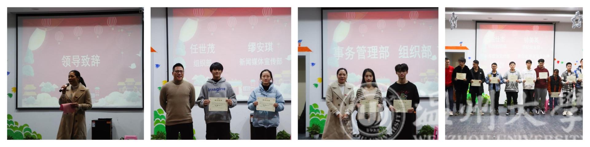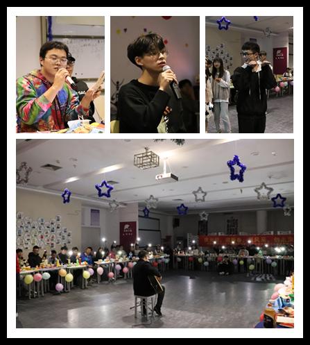 晚上18:30,大会正式开始。史贽豪同学向在场同学逐一介绍出席本次会议的领导和老师,同学们报以热烈的掌声与崇高的敬意。晚会第一篇章:赞·青春——表彰先进。首先,由公司党委副书记曾蓓蕾老师发表致辞,她总结本学期团学的工作,肯定了团学对于学院发展和员工成长所做出的的重要贡献,鼓励团学成员再接再厉,她还提出新一年的期望,并预祝大家元旦快乐。随后,章窈尔同学宣布获十一月先进个人称号与星级部门的名单,由曾蓓蕾、廖晓安、岳通通、潘龙飞五位老师分别为获奖同学与星级部门代表颁奖。表彰之后,柳超宇、宓哲文带来歌曲《会不会》,他们动情的歌声表达了自己对于团学的热爱,紧接着进行第游戏和抽奖环节——《听歌识曲》,同学们争相举手回答歌曲。晚会第二篇章:聚·青春:同舟共济。首先,由素拓实践部成员带来小品《不差钱》,他们精彩的表演赢得了现场的掌声。随后,吴天愉带来歌曲《可乐》,青年志愿者服务部成员带来歌曲《告白气球》,使得现场气氛逐渐推向高潮。最后,进入第二轮游戏环节和抽奖环节——《快乐传真》。晚会第三篇章:唱·青春:逐梦前行。首先潘龙飞老师带来吉他弹唱——《夜空中最亮的星》,同学们沉浸于动听的歌声,希望2021年,大家努力奋斗,争做“最亮的星”。随后,组织部成员带来歌曲《陪你度过漫长岁月》,表达告别20年迎接21年的激动心情。接着,桂鑫洋、姚仕杰带来歌曲《菲菲》。伴随歌声,晚会进入第三轮抽奖环节。