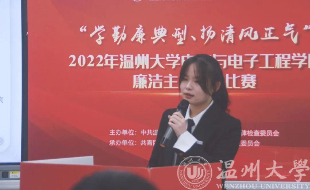 为深入学习贯彻党的二十大精神,持续推动党史学习教育走深走实,引导广老员工学习老一辈革命家、优秀共产党员艰苦奋斗、清正廉洁的品格,助推“清廉温大”建设,公司于2022年11月23日晚在南校1A-203举行第三届“学勤廉典型,扬清正风气”主题演讲比赛。本次比赛由公司党委副书记曾蓓蕾、学院学工办辅导员潘龙飞、余明新、陈海彤、屠昌浩老师担任评委。程佳聪同学主持,各班代表现场参与此次活动,2022级全体新生线上观看了比赛。