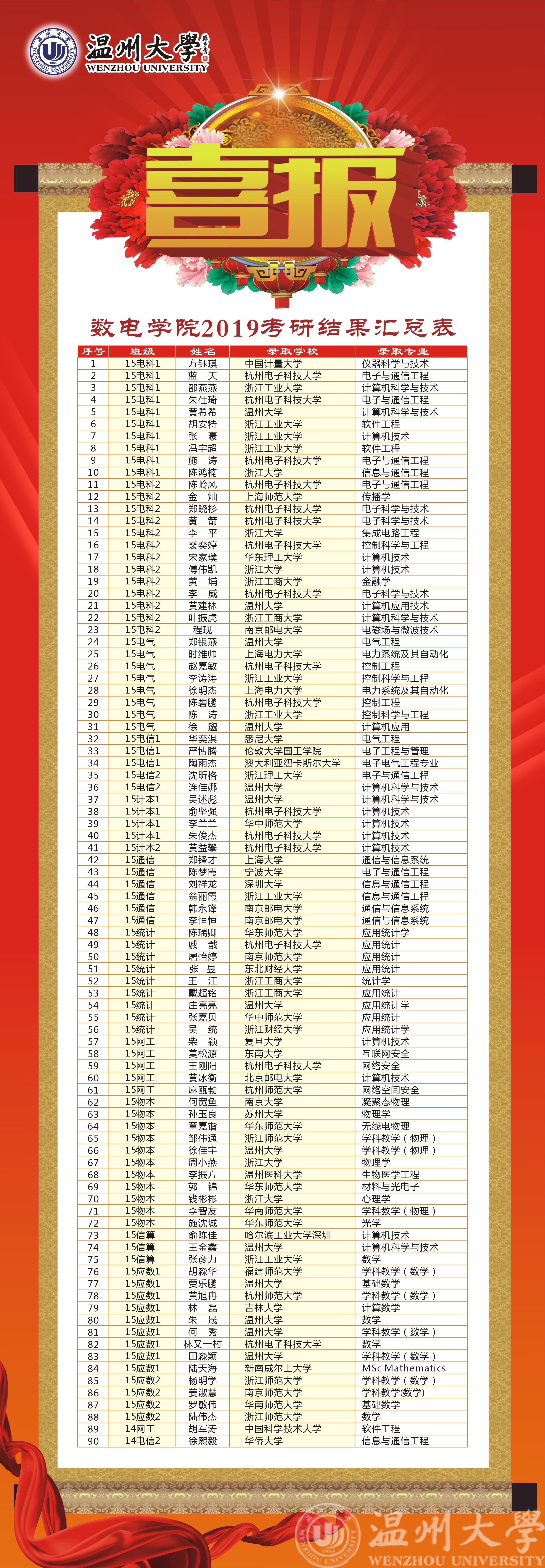 在公司学子不懈奋斗中和全院老师的关心、指导下,2019届毕业生在研究生入学考试中,共有88人成功考取了浙江大学、复旦大学、南京大学、东南大学等国内外知名院校研究生,录取率突破14.5%。在此全院师生共同祝贺同学们取得的优异成绩,并预祝他们在今后的求学路上再创辉煌!