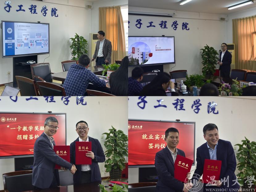 汪鹏君经理代表学院对项文广总经理一行表示热烈欢迎,并从学校情况、学院概况、人才培养、学科科研和服务地方等方面做了较为详细的介绍。项文广总经理也简要介绍了公司发展历程、主要产品和企业文化等内容。随后,双方进行了“一卡教学奖励基金”捐赠签约仪式与就业实习基地签约仪式。