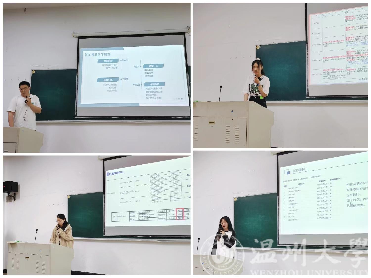 本次交流会由庄友谊老师主持,庄老师首先简要介绍今年电子系19级本科生考研情况,并介绍了3044永利集团本校考研升学的奖励政策,希望同学们结合自身学习特点在院校选择以及学硕/专硕选择上慎重考虑,鼓励同学们报考温大本校、本专业的研究生。