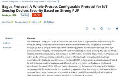 物理不可克隆函数(Physical Unclonable Function, PUF)是一种新型的硬件安全原语,通过提取集成电路制造过程无法避免引入的随机工艺偏差,可产生具有随机性、唯一性和防篡改特性的特征密钥。基于PUF的设备认证协议相较于基于传统加密和密钥管理的认证方法具有更高的安全性和鲁棒性。针对物联网设备认证协议开销与性能无法兼顾的技术瓶颈,公司汪鹏君教授团队提出一种面向物联网感知设备的全流程可配置安全认证协议,该协议的核心加密算子源于我国传统五子棋局八卦阵。协议针对不同设备配置不同八卦矩阵的加密方式,以提升强PUF的抗机器学习攻击能力和协议的抗重放暴力攻击能力,从而最大限度地降低敏感数据泄露的风险。通过搭建自主测试平台,验证该协议可极大提升感知设备的全流程安全,并能够优化感知层资源的分配效率。