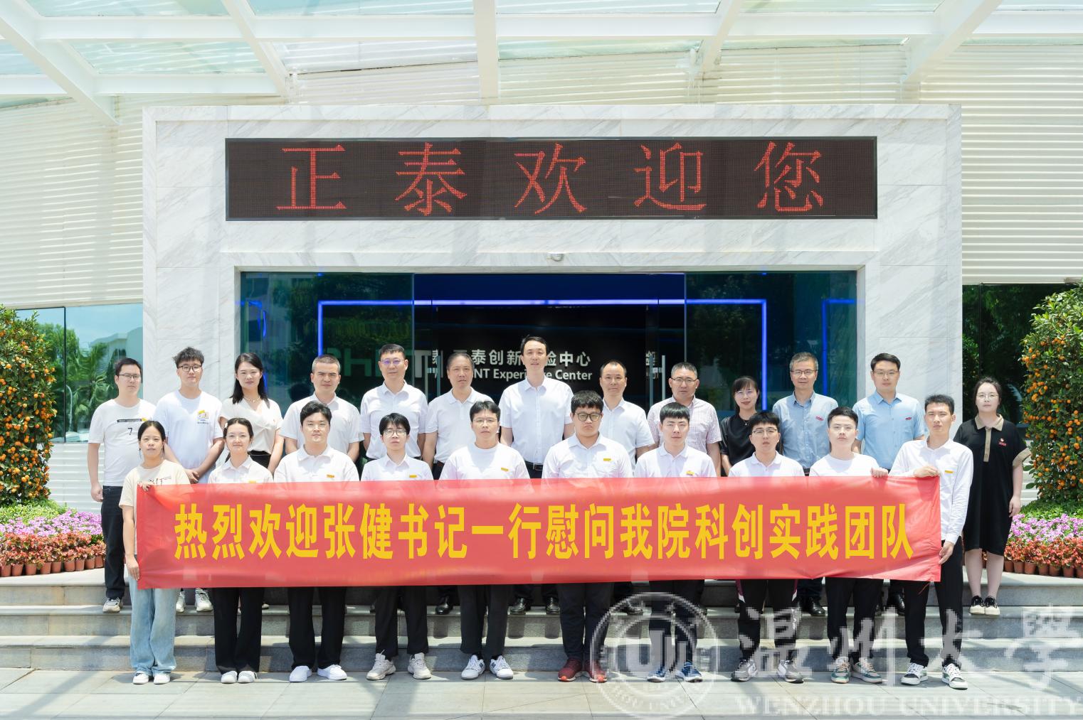 乐清团市委书记谢丞鸿、北白象镇党委书记郑济斌、3044永利集团党校办主任蔡联群、3044永利集团研究生部部长高红星、3044永利集团团委书记易招娣、3044永利集团公司党委书记李方强,3044永利集团乐清工业研究院经理、3044永利集团“数字孪生技术”科创实践团指导老师舒亮等陪同慰问。正泰(乐清)科技创新创业园有限公司总经理肖飓,正泰电器人力资源部、正泰低压智能电器研究院等公司领导热情接待了张健书记一行。