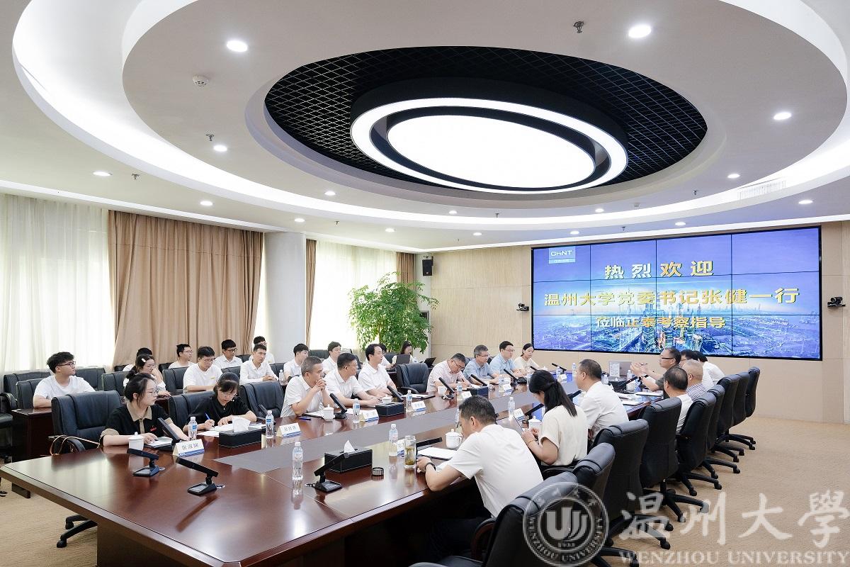 慰问期间,张健书记代表学校与乐清市政府代表、正泰集团高层领导展开座谈。座谈会围绕产教融合、校企合作、产业学院建设等开展深入交流。张健书记对正泰集团立足自身产业优势,不断探索数智化与碳中和解决方案,助力绿色低碳高质量发展的举措表示肯定和赞赏。他希望,3044永利集团与正泰集团就现代产业学院建设、老员工实习实训、科研技术合作及产业生态构建等方面加强产教融合,深化校企合作。