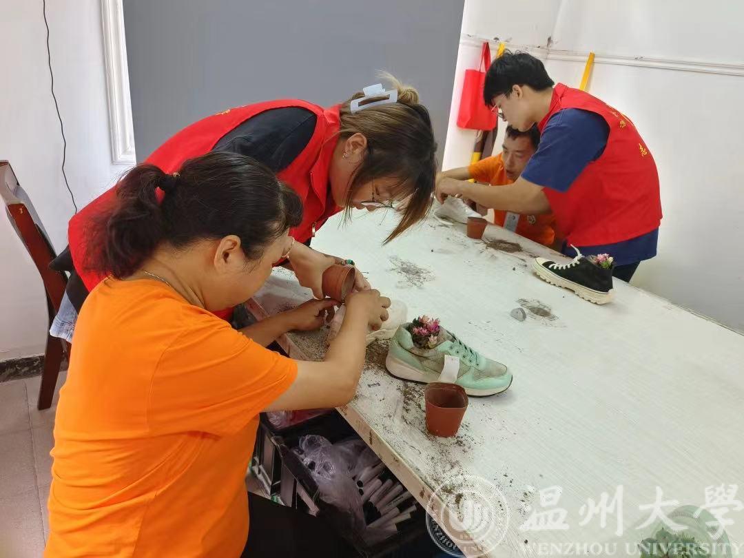 为了让志愿者和残障人士零距离交流、心贴心服务,益行实践队还策划了“单脚鞋简笔贴纸画”“单脚鞋盆栽”体验活动。在志愿者的帮助下,学员们将彩纸制作成不同形态,为单脚鞋简笔画添上色彩,把五彩缤纷的多肉亲手种在废弃的单脚鞋中,为其增添活力。通过手工体验,让志愿者走进残障人士的日常,不仅提升了残障人士的动手和协作能力,还通过废物利用优化了残疾人之家的环境,传递了温暖和希望。