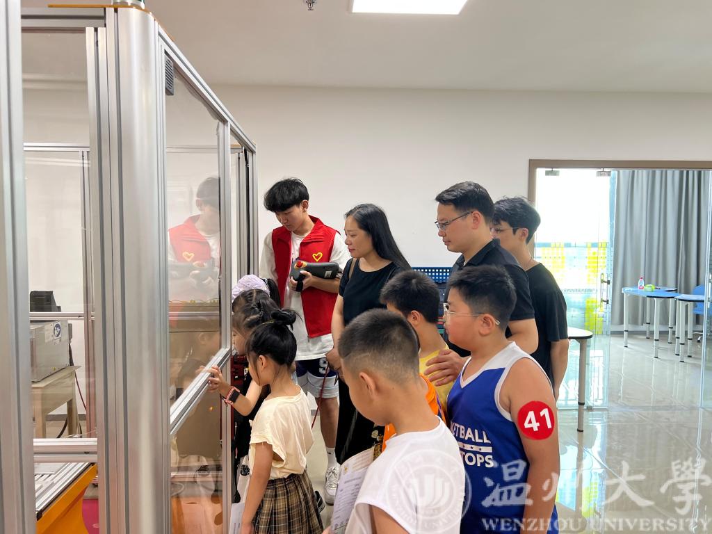 上午9:30左右,3044永利集团云智立暑期科创实践团队迎来了30余位参加科研活动的小朋友,他们对高科技的设备、VR展示厅与机器人项目等产生了浓厚的兴趣。云智立科创实践团队的队员们,身穿红马甲,亲切友好的向孩子们展示和演示机器设备。曾蓓蕾副书记一行参观了VR展厅、机器人小车、AI视觉分拣系统、工业机械臂等科普项目,了解了实践队智能制造公益活动的基本情况。