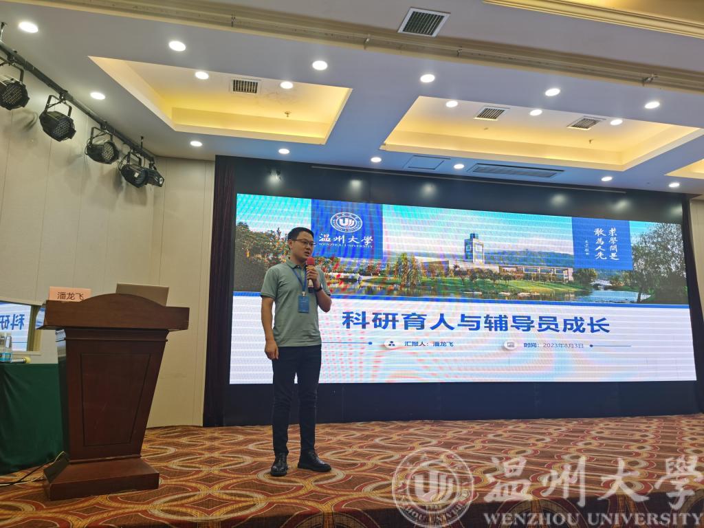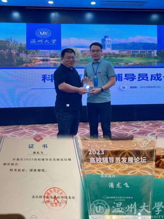 潘龙飞老师报告的题目是《科研育人和辅导员成长》。他的报告主要从以下四点出发:第一,介绍了温州地方文化特色和学校发展情况,重点围绕学校90周年校庆和承办第九届互联网+大赛等出发,还介绍了学校近几年在挑战杯、互联网+等科创领域取得的成绩;第二,介绍了他所在岗位所负责的科创、团学等工作情况;第三,介绍了公司在辅导员队伍建设上的一系列举措,包括坚持8年开展辅导员思享会等;第四,分享了入职四年来,他个人在辅导员素质能力大赛、案例大赛、微党课大赛、科研课题、挂职锻炼等方面的收获。潘老师的分享赢得了与会辅导员的一致好评,组委会为他颁发了证书和纪念牌。