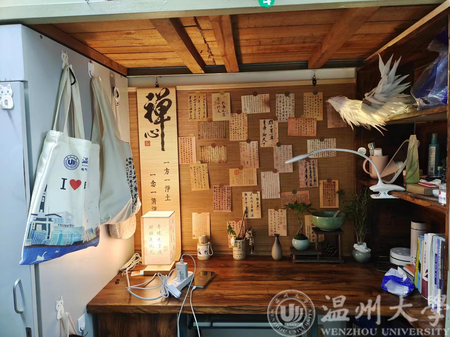 在走访过程中我们也看到各寝室通过合理搭配购置家具、墙纸和装饰画、绿植等元素,打造出个性化、时尚、新颖的寝室空间。