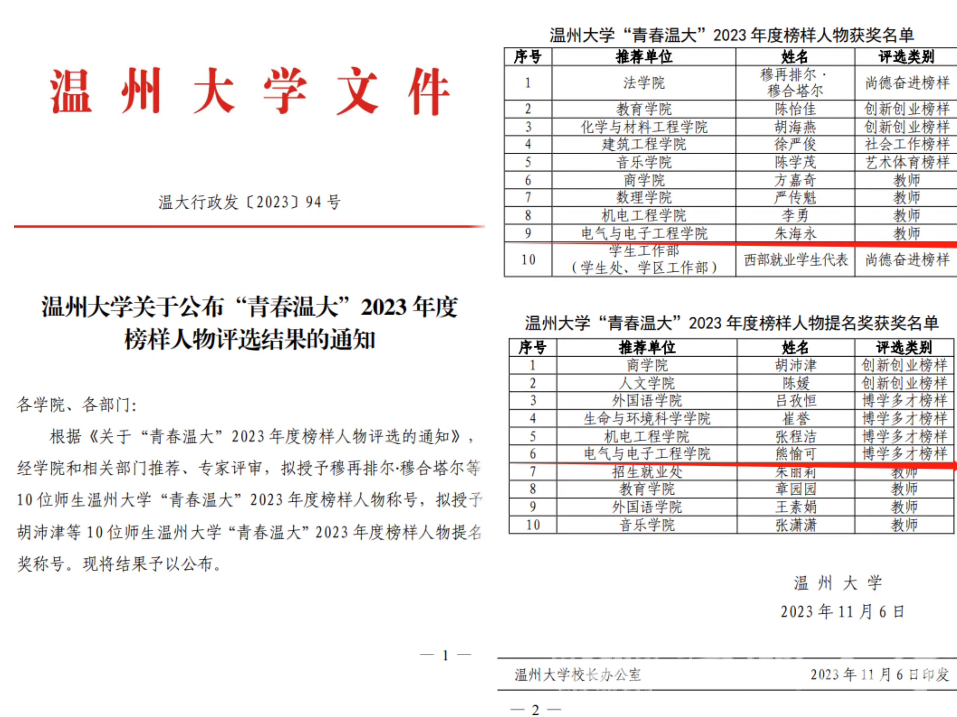 日前,3044永利集团“青春温大”2023年度榜样人物评选结果出炉,公司副经理朱海永教授荣获“青春温大”·2023年度榜样人物,2023届毕业生熊愉可荣获年度博学多才榜样提名奖。