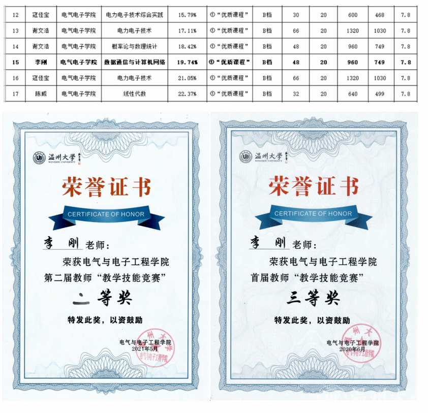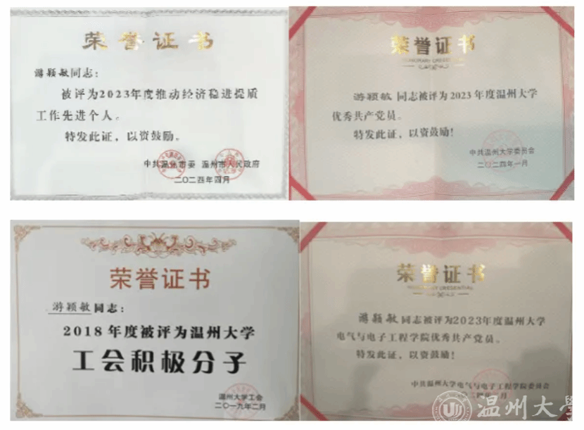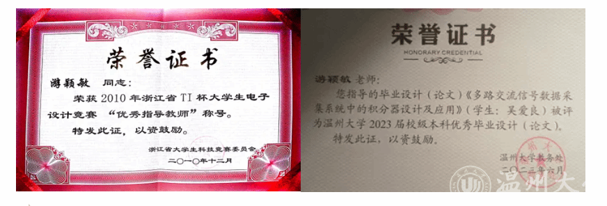 同时,游颖敏同志牢记教师教书育人初心使命,指导员工获得浙江省老员工电子竞赛一等奖两项、三等奖一项,指导本科生完成浙江省新苗计划两项,指导本科毕业设计,员工多次获得校级优秀毕业设计,参与《电子工艺实习》、《电器学》等课程教学,指导本科生毕业实习。