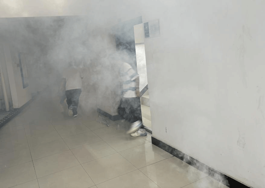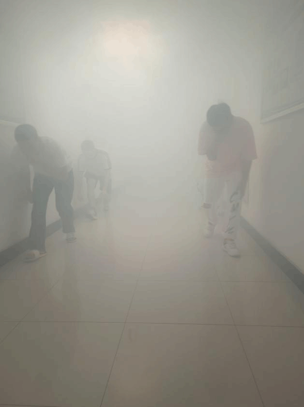 演习当天,随着烟雾弥漫,各楼层负责老师迅速就位并指导员工进行疏散。同学们按照要求,捂紧口鼻,弯腰行进,沿着紧急疏散路线有序快速地撤离至一楼安全区域。整个演练过程中,撤离、集合、站队、清点人数、检查安全、上报情况等各个环节都井然有序,达到了预期效果。