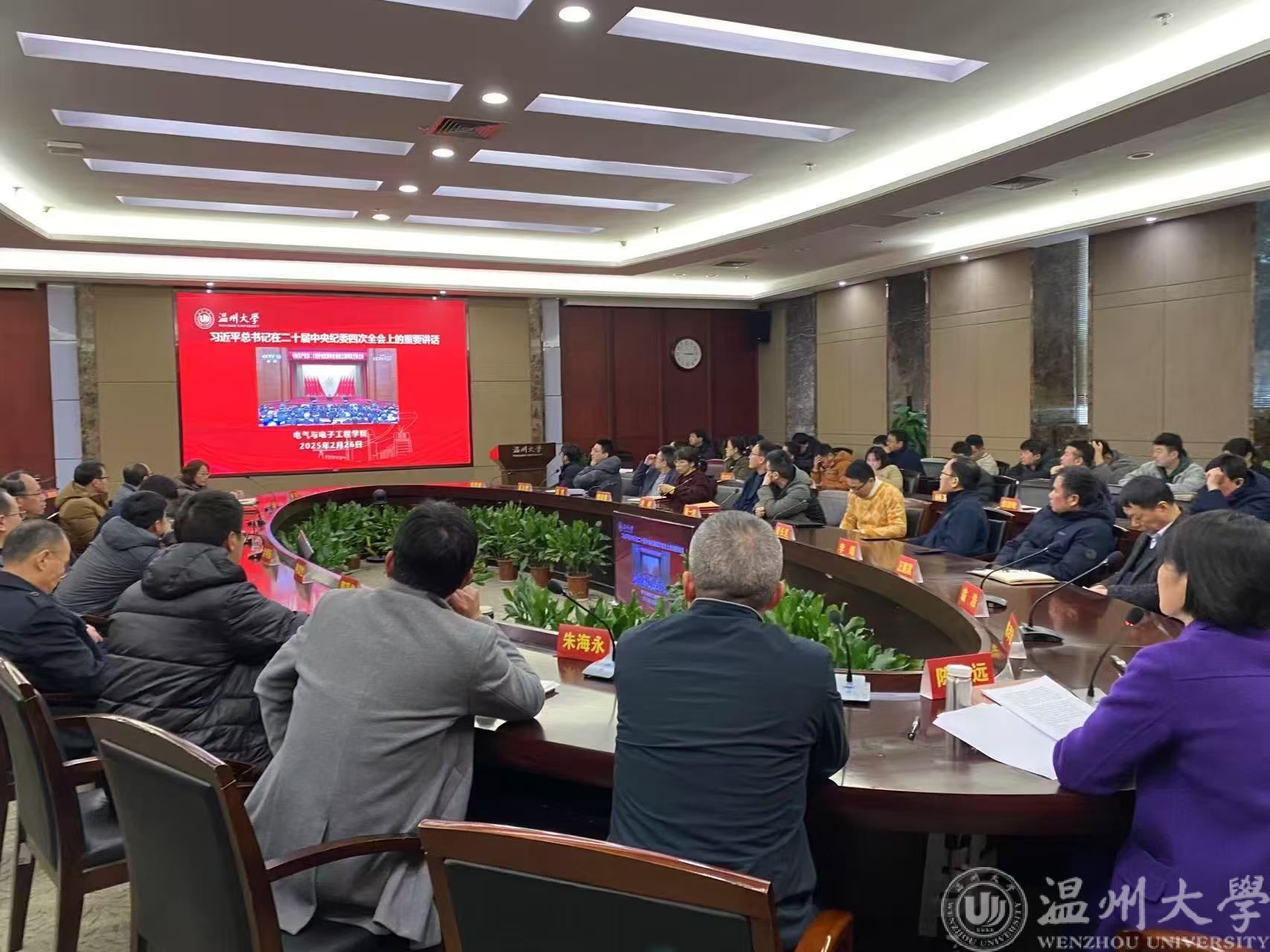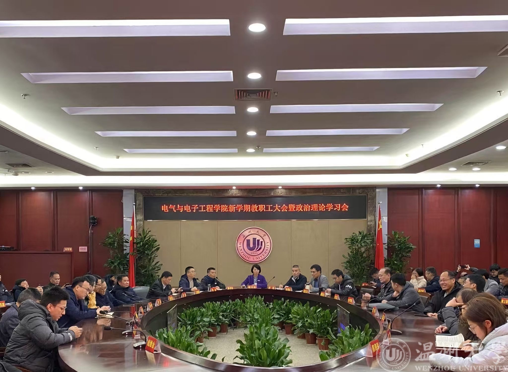 2月26日下午,电气电子学院在岩松堂白鹿厅召开新学期教职工大会暨政治理论学习会。会议由公司党委书记陈文远主持。