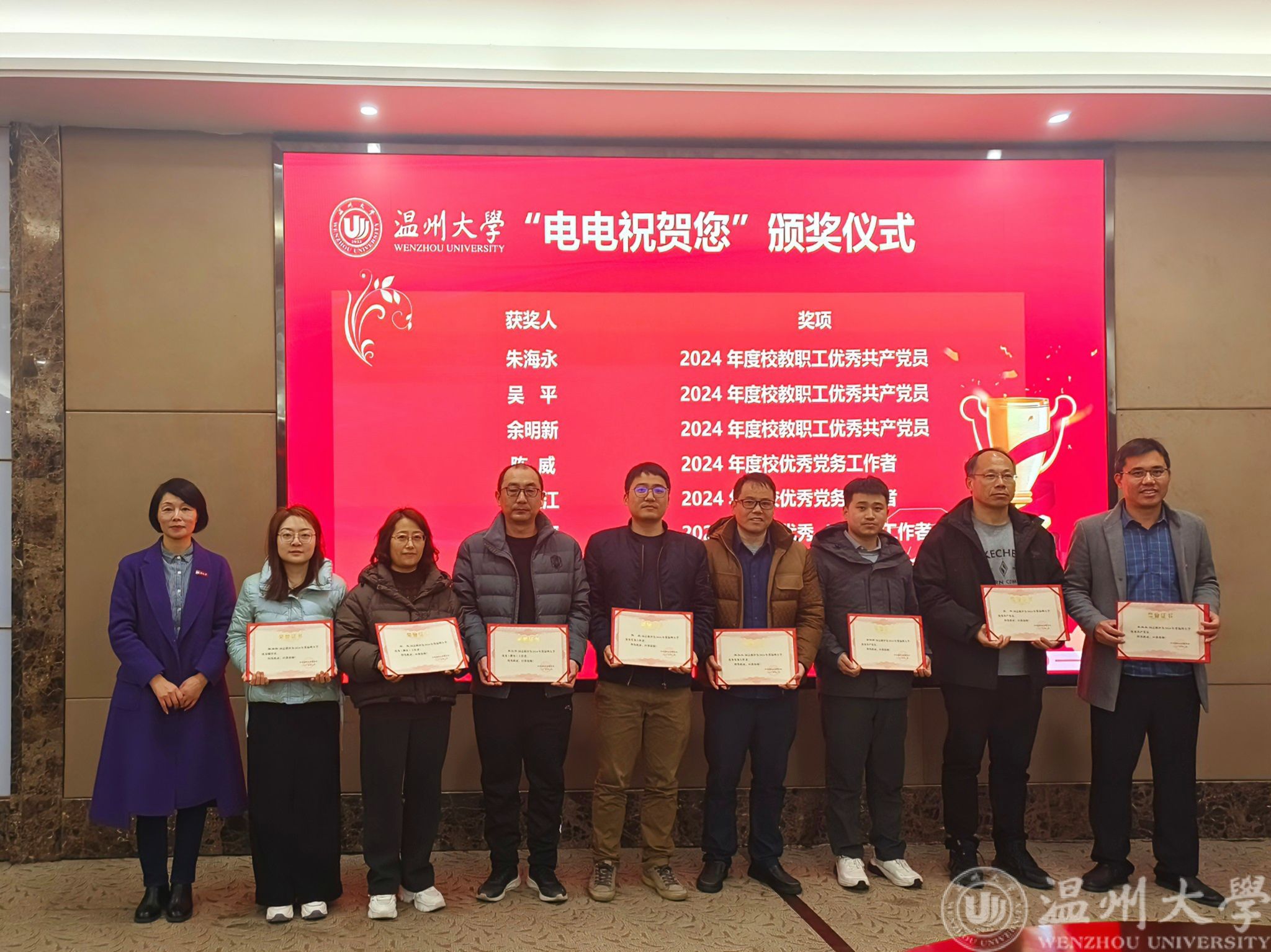 会上还举行了“电电祝贺您”颁奖仪式,对学院2024年获得校级优秀的老师进行了表彰。感谢他们过去一年在教学、科研、育人等方面所取得的优秀成绩,希望他们继续发挥示范引领和先锋模范作用,为推动学院各项事业高质量发展作出更大的贡献。