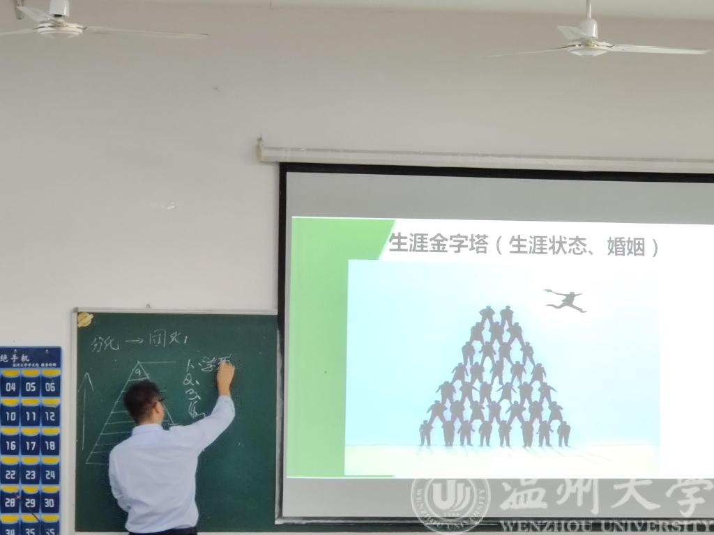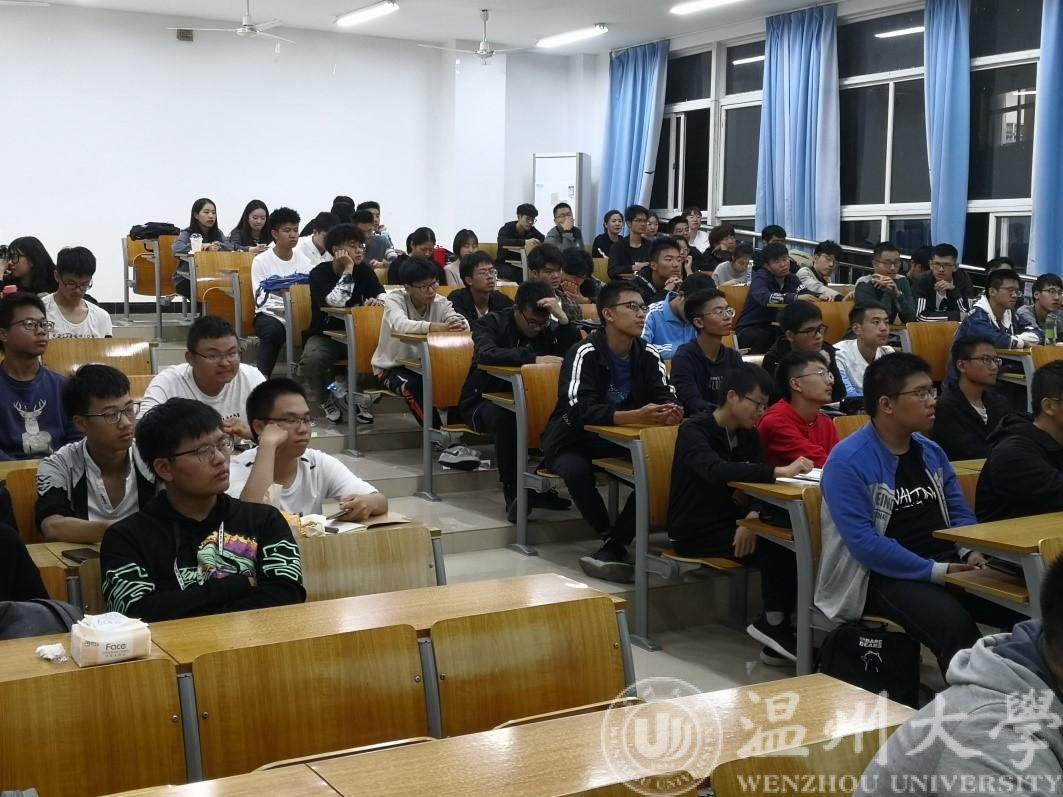 吴老师充分运用了一些案例名言以及自己的生活体会为同学们清晰地指出了未来发展的道路以及为社会做出贡献的六个要素:学历、知识、创业、资本、技术、体力。“生涯金字塔”生动地让同学们了解到了学历重要性。“金字塔的顶端是脑力工作。”吴老师认为在大学这个窗口期,同学们应当大一适应生活,养成习惯;大二参加活动,探索社会;大三聚焦生活,改写人生;大四创造选项,选择路径。