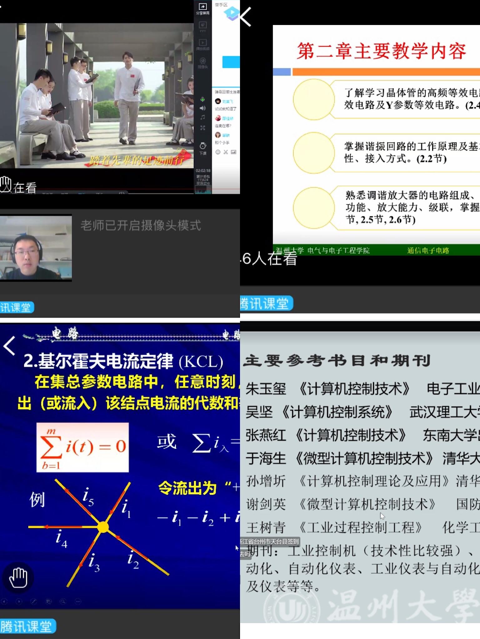 2月17日,原本是学校正式开学的日子,但疫情当前,师生无法返校给本学期的教学工作提出了最大的挑战。电气电子学院按照学校“停课不停教,停课不停学”统一部署与要求进行线上教学安排。2月24日,迎来线上开课的第一天,学院11门课程顺利开展线上教学。校领导钱强带队参加了公司施肖菁老师的《电子电路分析》课程的网上直播教学,同时,公司领导、各系主任、专业负责人、学院教学督导、学院线上教学督导、教务科、员工科也积极参与上网跟踪课堂效果和质量,随时做好反馈工作;老师们准备充分,应急方案有效;同学参与积极性高,学院线上教学工作开展顺利。