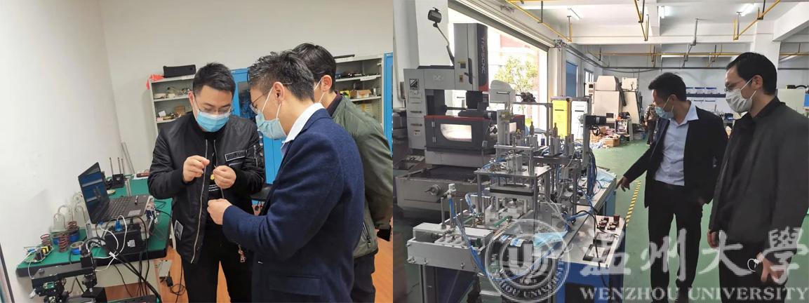 会后,浙大台州院林相华陪同温智锁院经理阮秀凯参观了浙大台州院中试车间、机器视觉实验室、光电检测等实验室。