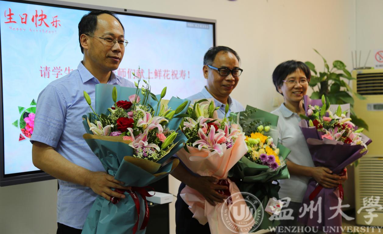 生日会由学院副书记曾蓓蕾主持,副经理朱翔鸥向寿星们祝寿。员工代表向生日教师献上鲜花并一起唱响《生日快乐》歌。借着鲜花和歌声,我们恭祝蒋小洛老师、施肖菁老师、吴平老师和叶鹏老师50岁生日快乐!恭祝张耀举老师60岁生日快乐!