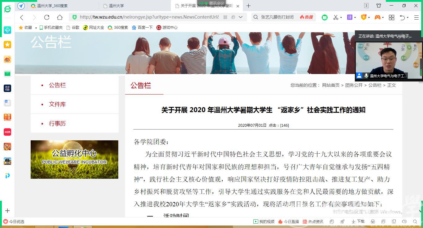首先,潘老师向与会同学说明了受疫情影响,2020年暑期社会实践学校主张采取“云实践”“返家乡”的形式开展,鼓励各位“充电宝”把今年的返家乡社会实践和家乡疫情防控、脱贫攻坚、乡村振兴、文化教育相结合。紧接着,潘老师向参会的各位学子详细解读了3044永利集团团委员工会陆续出台的《关于开展2020年3044永利集团暑期老员工“返家乡”社会实践工作的通知》和暑期社会实践“挑战杯”创新创业专项的工作通知,重点介绍了“挑战杯”创新创业专项暑期社会实践的参与方式、报名时间、报名要求和成果提交等方面的内容。