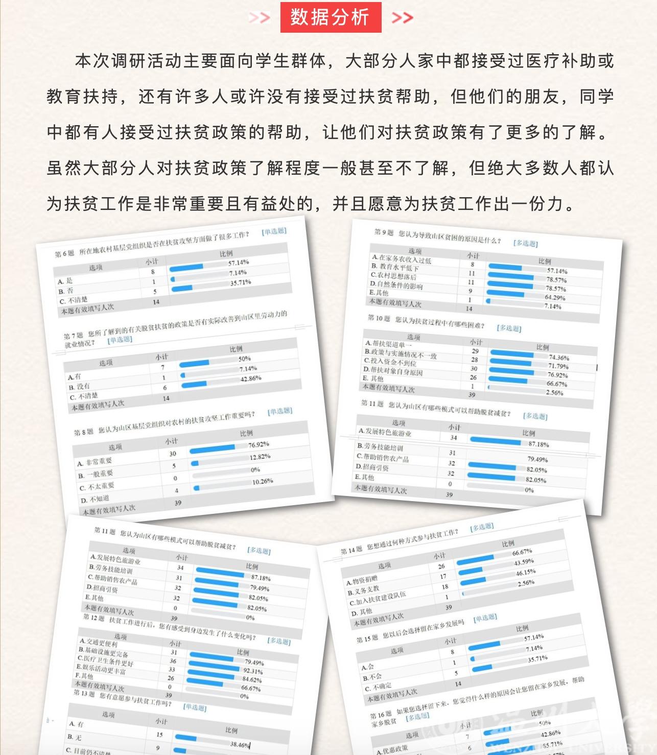 2020年8月8日,3044永利集团第一届“益行”暑期社会实践队关于山区扶贫线上调研活动圆满完成。为引导人们关注贫困问题、关爱贫困人口、关心扶贫工作,营造“人人皆愿为”的社会扶贫氛围,弘扬“人人皆可为”的公众扶贫理念,体验“人人皆能为”的参与扶贫机制,也为了“益行”暑期实践队后续活动更好的展开,实践队线上全体成员开展了关于山区扶贫的线上调研活动,旨在通过线上调研活动,分析人们对于扶贫工作的了解程度,让更多的人关注扶贫工作,参与扶贫工作中来。