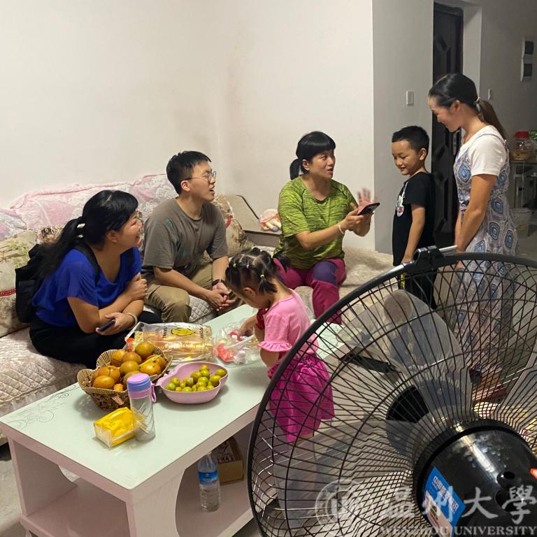 线下成员走访了一个孩子的家庭,为这个孩子送上了自己亲手编织的围巾,这个小孩子曾经在山里生活,因为上学的事情,愁坏了他们的父母,只有在县城里有学校,他们从山里开车到县城里需要花三个小时的时间,所以他们只能在学校附近租房子,对于他们而言,在经济上更是雪上加霜,然而现在他们搬进了小区县城的房子里生活,省去了一笔不必要的开销,孩子的母亲穿的衣服整洁大方,同时也化了妆,看上去更年轻、更有气质了。线下成员也走访了很多小区里的家庭,在了解他们生活变化的同时为他们送上了温暖,带去了面包和水果,同时我们记录了很多家庭的联系方式和家庭地址,准备回到温州之后给他们寄一些文具和书本,使他们的学习生活不在因为文具而烦恼。而线上成员为线下安排了出行方式和路程,大大提高了效率。