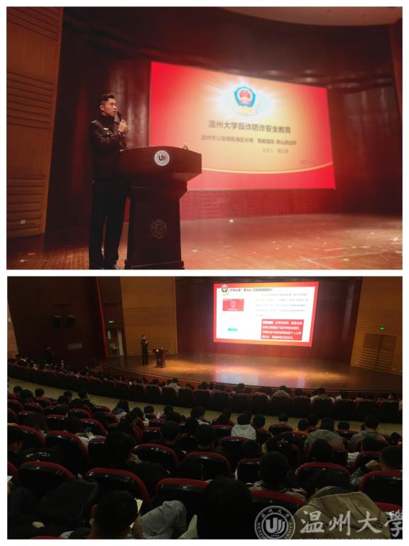2021年4月14日下午,公司于南校音乐厅面向全体19级与20级学生举行了“反诈防诈网络安全教育”主题讲座。本次讲座邀请到了温州市公安局瓯海区分局高教园区茶山派出所的周文涛警官向同学们进行防诈反诈的安全教育。