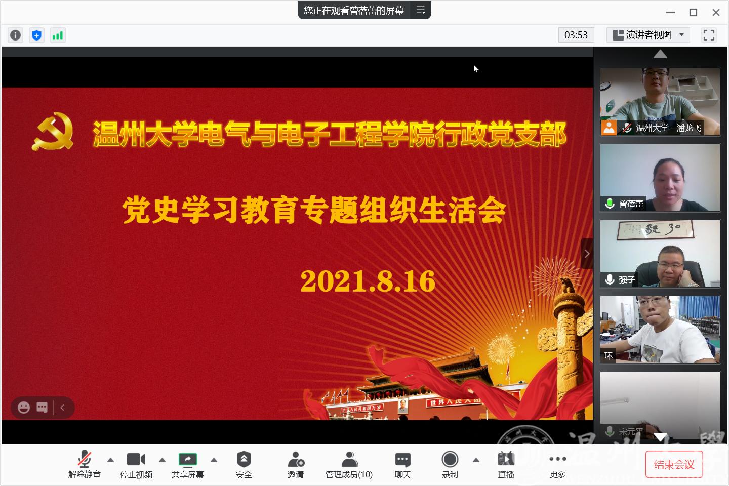 根据市和公司党史学习教育领导小组部署要求:“七一”后基层党组织要围绕“学党史、悟思想、办实事、开新局”为主题,认真贯彻“学史明理、学史增信、学史崇德、学习力行”要求,以党支部为单位,组织党员召开一次专题组织生活会,交流学习体会,查找差距不足,引导广大党员不断增强“四个意识”、坚定“四个自信”、做到“两个维护”。8月16日上午9:00,公司行政教工党支部召开党史学习教育专题线上组织生活会。