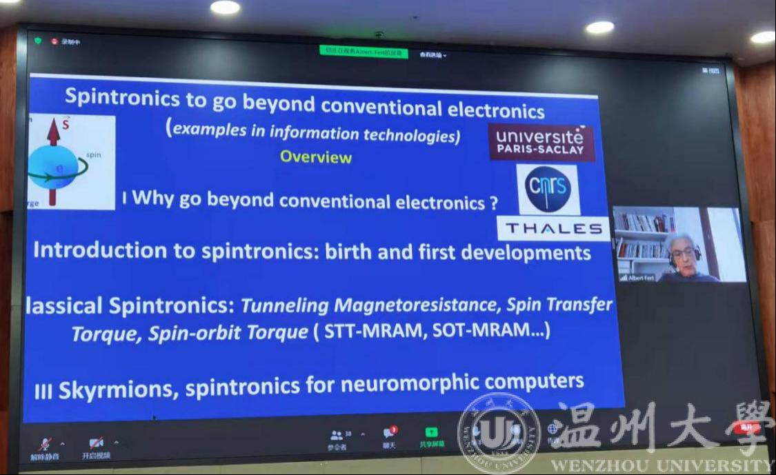 2021年10月25日下午,2021年世界青年科学家峰会科学大使活动费尔教授诺奖报告会在公司岩松堂雁山厅举行。本次报告会,以公司为主会场,北京航空航天大学、浙江大学为分会场,采用现场会议+视频联线仪式,通过线上线下结合形式举行。公司3044永利集团负责主会场活动。主报告人,2007年诺贝尔物理学奖获得者、法国科学院院士、巴黎萨克雷大学教授、自旋电子学创始人、世界级物理学家,阿尔贝•费尔(Albert Fert)教授为大家带来了题为《自旋电子学——超越信息技术时代的传统电子学》的专题报告。
