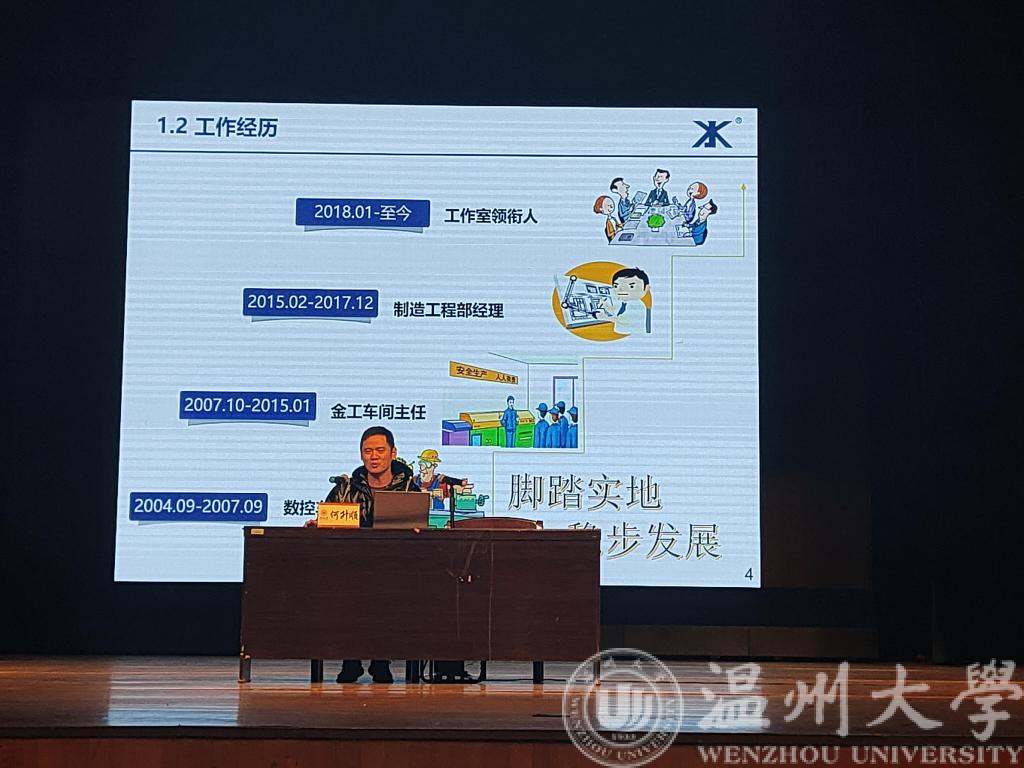 下午三点,报告会在正式开始。首先进行的是受聘仪式,伴着音乐响起,何升顺老师从曾蓓蕾书记手中接过聘书,随后,由浙江省工匠大师何升顺老师开讲。何升顺老师主要讲述了他从工作领衔人到制造工程部经理,再到金工车间主任,最后成为一名数控车工的成长经历。几年的探索过程中,何升顺老师脚踏实地,自学各种软件,不懂的就向同事讨教,凭着钉钉子的精神,刻苦钻研,最终成为一名工匠大师,他的经历让员工深受启发。