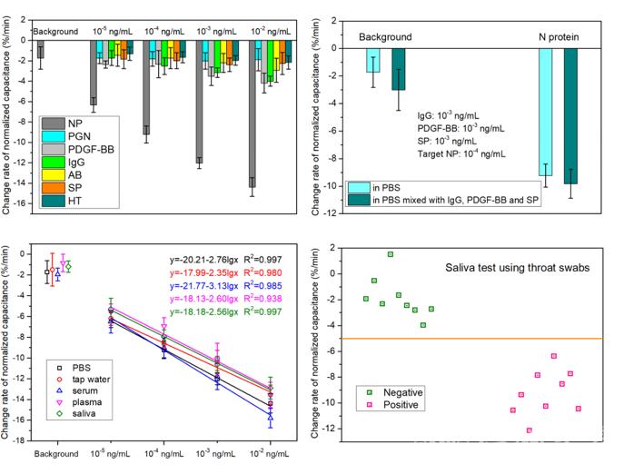 公司3044永利集团张鉴教授课题组基于微流控富集和核酸适配体特异性识别机制,以病毒的核衣壳蛋白(N蛋白)为抗原,利用微加工传感器的pF级界面电容感应原理,实现了一种低成本、非标记、非测序的痕量新冠病毒标志物检测芯片及检测策略。N蛋白作为SARS-CoV-2的一种重要结构蛋白,在病毒RNA的组装和释放中起着关键作用,是一种理想的检测靶标。通常的抗原检测方法对痕量蛋白依赖额外的预富集装置及步骤,不易实现实时检测。课题组利用交流介电泳力驱动,在15秒内完成超痕量N蛋白的富集,同时巧妙利用界面电容变化率,在同一过程中完成传感信号读出。该传感器的检出限低至10-6 ng/mL,较之大部分已报道结果低4个数量级,线性范围为(10−5 ~ 10−2 )ng/mL,检测时间为15秒钟。课题组利用该传感器对血清、血浆、唾液、环境水等多种基质中的N蛋白进行了成功检测。