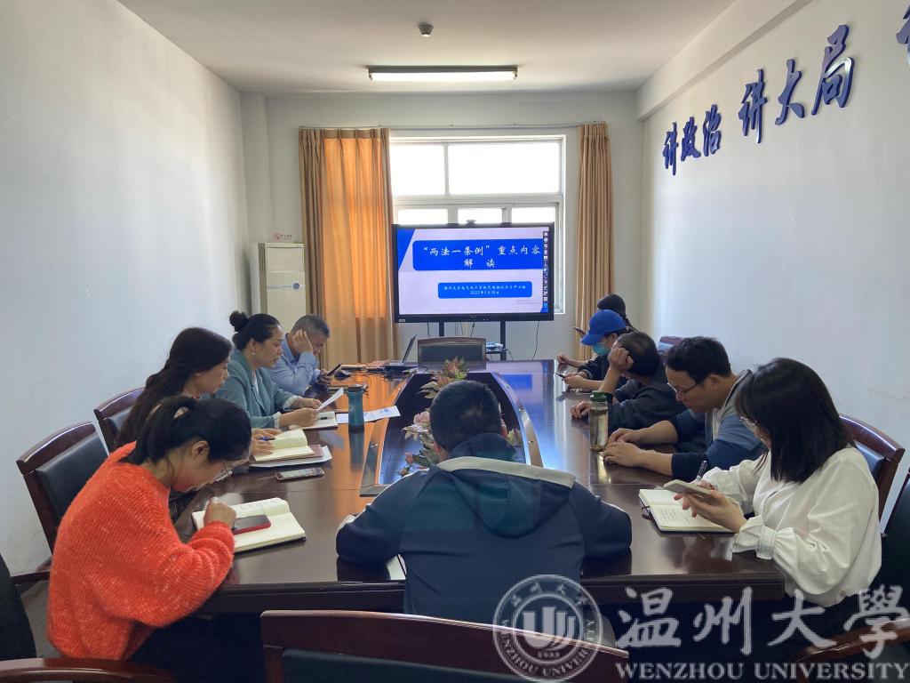会议第一项,行政教工党支部书记曾蓓蕾详细部署了本学期行政教工党支部“三会一课”、支部活动、党员学习等内容,重点介绍了本学期主题党日活动的安排。紧接着,曾书记作“两法一条例”重点内容的解读,带全体支部党员学习了《中华人民共和国监察法》《中华人民共和国公职人员政务处分法》和《中华人民共和国监察法实施条例》的相关内容。曾书记指出,支部全体党员要紧紧围绕“两法一条例”的核心内容和重要要求,进一步深化学习,要严守政治纪律和廉洁要求,积极将学习心得和学习成果融入到老员工法治教育中去。切实提高党性修养、增强“四个意识”,懂法规、明戒惧、知敬畏、守纪律,自觉做学习贯彻的表率。通过此次专题学习,进一步帮助支部党员教师领会了“两法一条例”提出的重要意义和存在的内在联系。