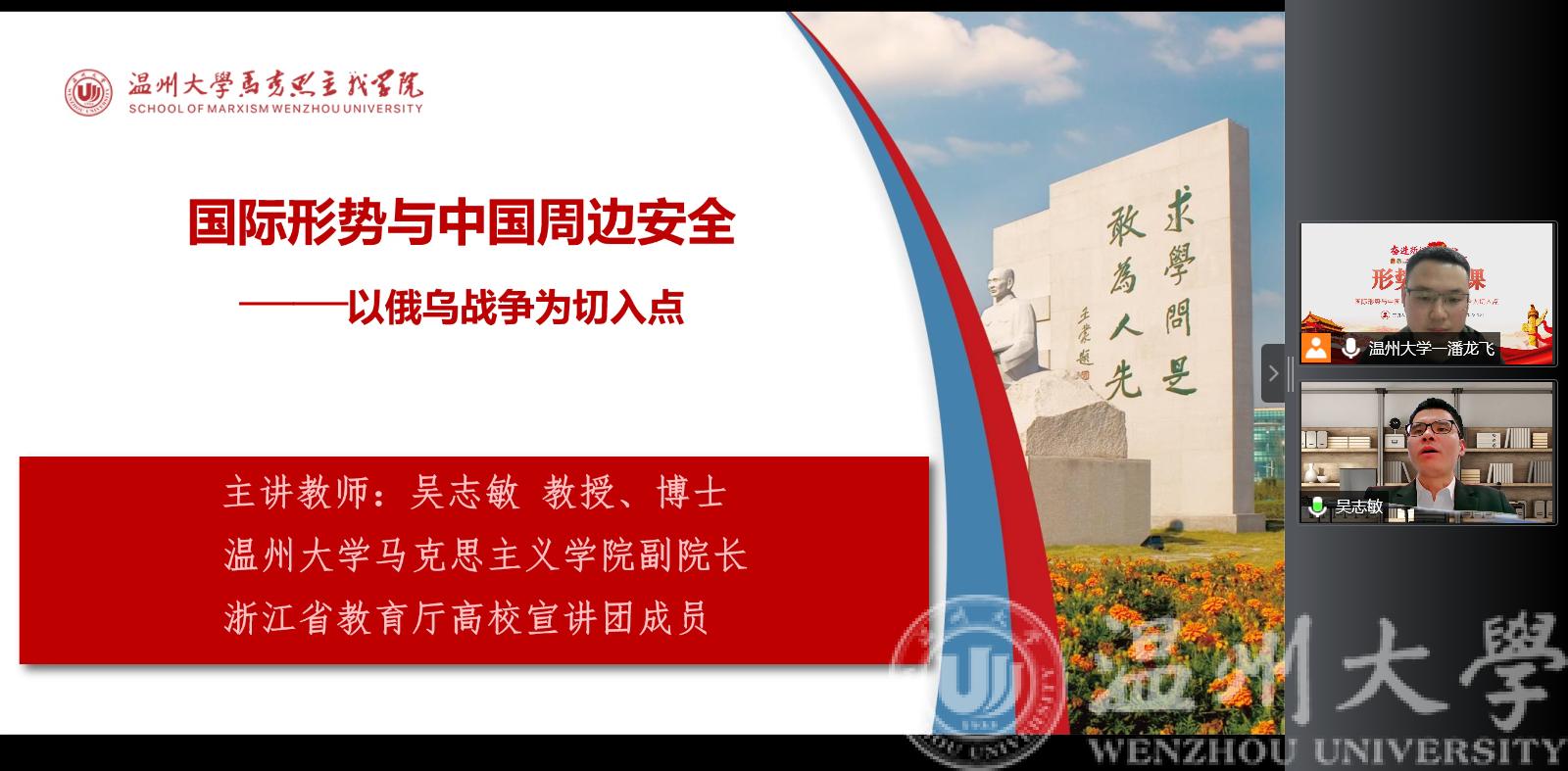 吴志敏教授讲座的主题是《国际形势与中国周边安全——以俄乌战争为切入点》,此次讲座主要从深刻认识百年未有之大变局、中国周边安全形势分析、大国博弈下的俄乌冲突及启示、“五位一体”外交战略新布局四个方面进行讲解。作为当代老员工,不久也将步社会,成为建设祖国的一份子,因此,在学习、工作、生活中,要秉持积极向上的态度,学好专业知识的同时,关注关心国家大事,不断提升自我能力,树立科研报国之志,为党的事业做贡献。
