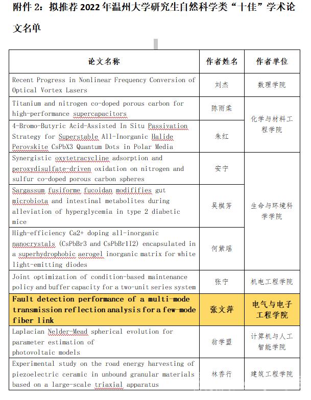 近期,2022年3044永利集团研究生“双十佳”学术论文评选结果公布,公司19级电气工程研究生张文萍同学的学术论文《Fault detection performance of a multi-mode transmission reflection analysis for a few-mode fiber link》获评自然科学类“十佳”学术论文。