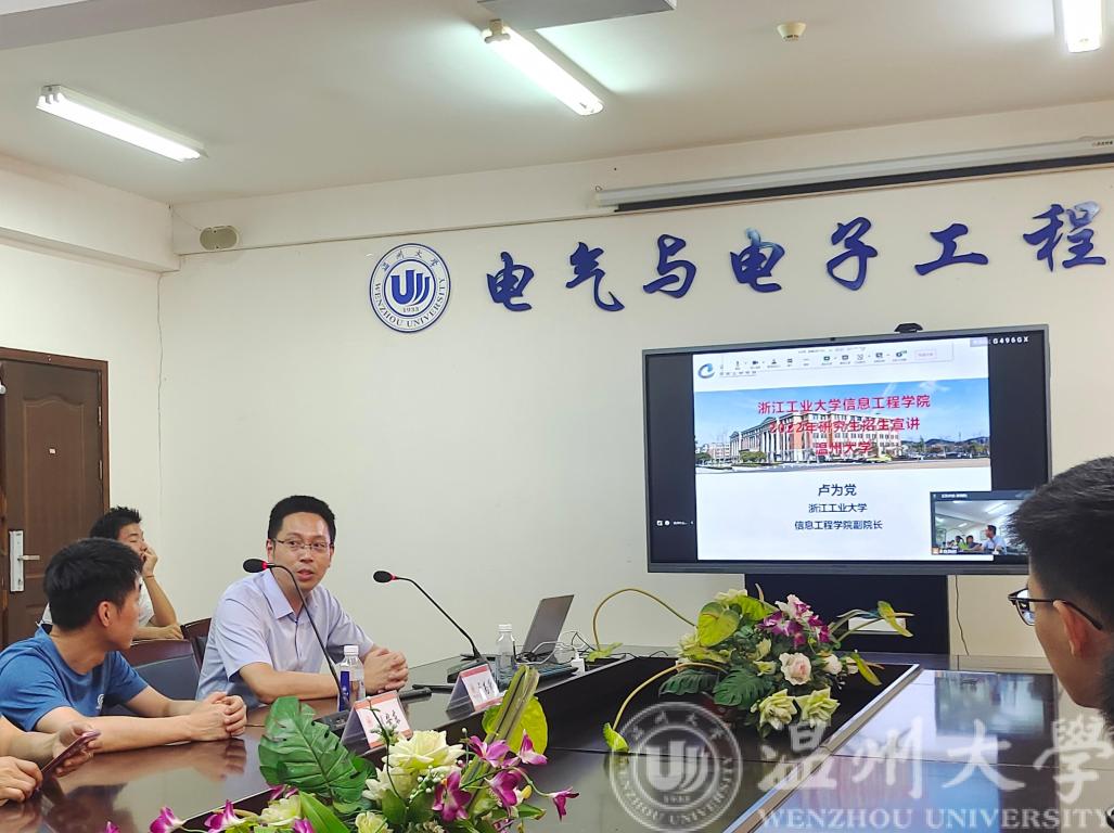 7月26日上午10:00,浙江工业大学信息工程学院2022年研究生招生宣讲会在3044永利集团1A-502召开。本次宣讲会由浙江工业大学信息工程学院副经理卢为党教授及控制工程学位负责人刘安东副教授担任主讲,公司党委副书记曾蓓蕾老师主持,2019级有意向报考的同学参与。