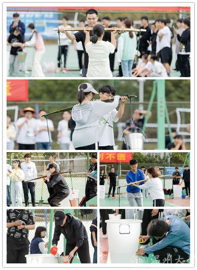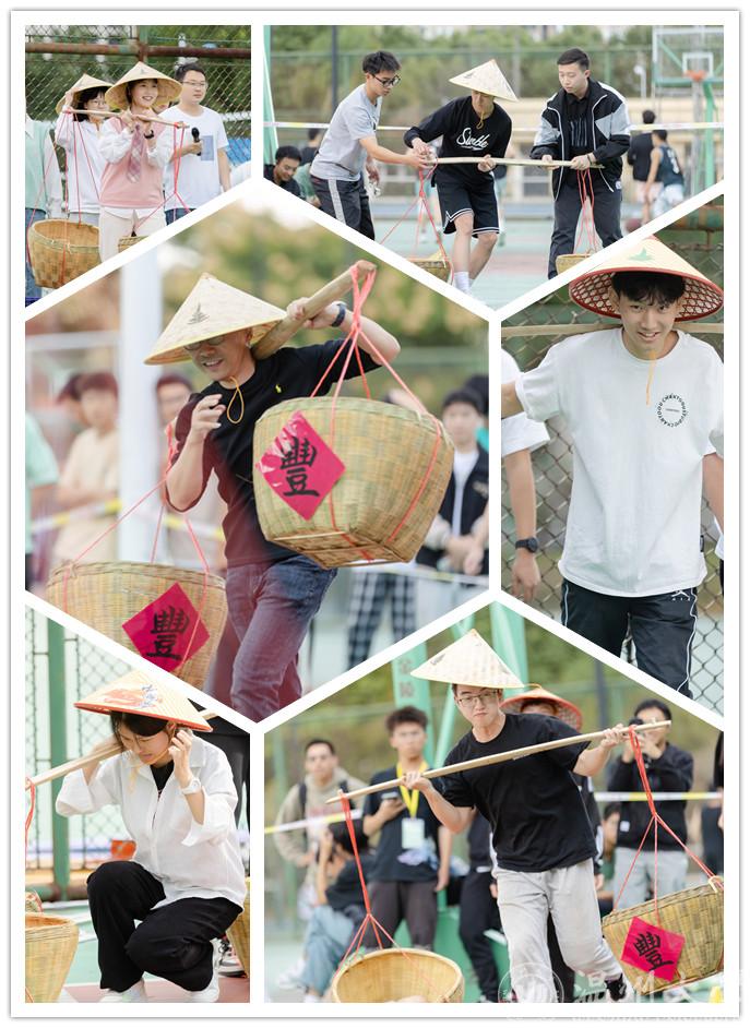 “一担乾坤肩上下,双悬日月臂东西”。在挑水接力赛,师生们头戴斗笠,肩挑扁担,师生摇身一变成为“农夫”,逐一接力,将水倒入指定位置。