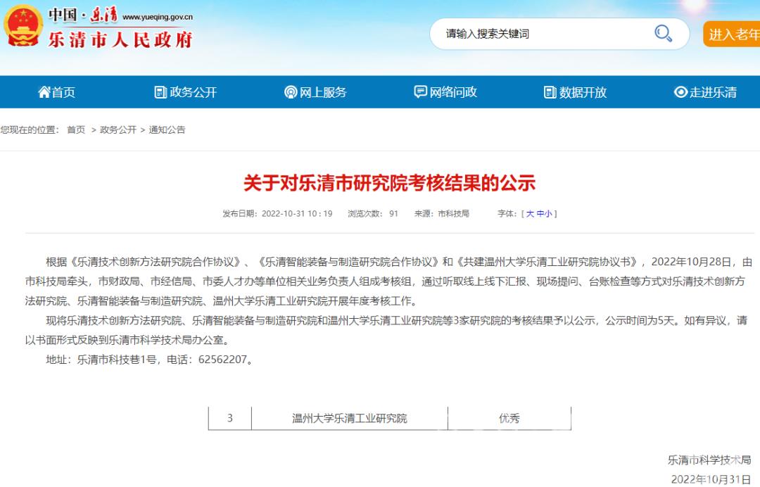 考核组通过听取线下汇报、现场提问、台账检查等方式对研究院年度工作进行评价,最终一致认为研究院较好地完成了协议书年度绩效指标。考核结果定档“优秀”,在乐清市人民政府网站公示,现已通过公示期。