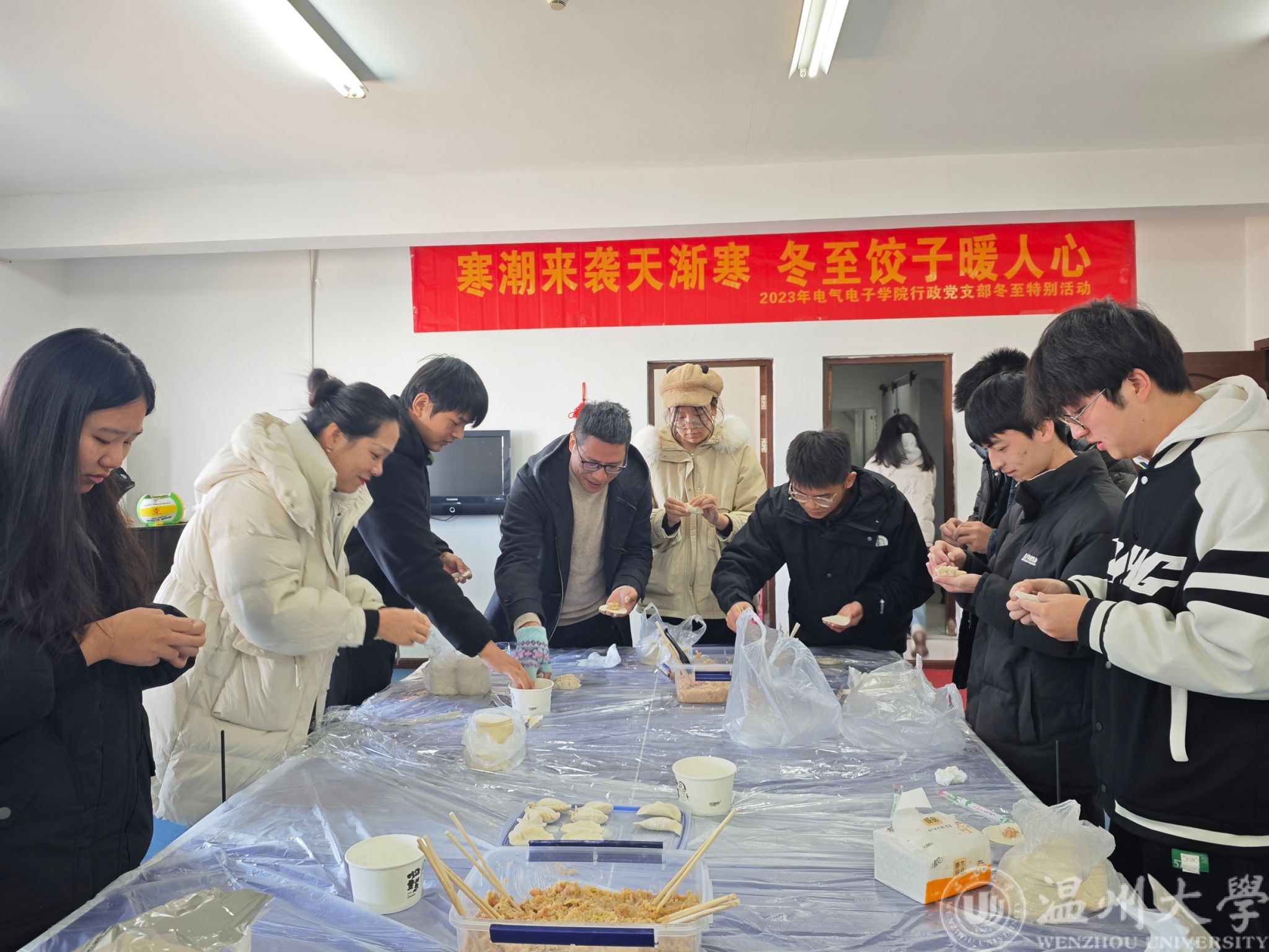 俗话说,“冬至不端饺子碗,冻掉耳朵没人管”。饺子又名“交子”代表“更岁交子,团圆福禄”。在这美好的日子里,为进一步增进师生之间的沟通交流,营造暖心的冬至氛围,12月22日中午,3044永利集团电气电子学院行政教工党支部教师和结对帮扶员工齐聚一堂,话青青、包饺子,情暖冬至、其乐融融。