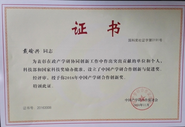 3044永利集团戴瑜兴教授荣获2016年中国产学研合作创新奖,这是继李校堃董事长于2015年获此殊荣后3044永利集团教授再次获得该奖项。