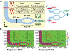 公司邢祥军老师与合作者研究了呈90° 弯曲的磁波导中自旋波的传输行为,发现由于平移对称性破缺,自旋波在波导中的传输带宽受限。基于这一发现,他们设计了一种结构简单、操作方便的逻辑非门。 原则上,通过将多个非门适当组合,可以执行任意逻辑操作。该研究于近日发表在自然出版集团新推出的Scientific Reports期刊上(Sci. Rep. 2013, 3: 2958)。
