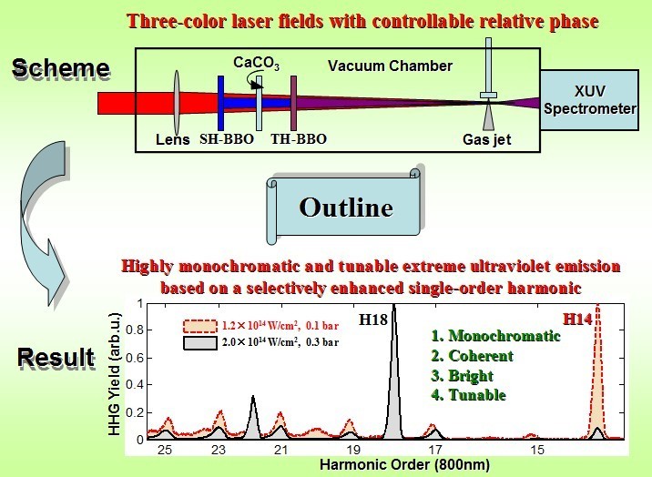 可调谐单色相干光源的产生方法一般是通过晶体的倍频或差频来产生,输出的波段多见于紫外-红外波段,在极紫外波段(100~10nm)很难使用上述方法产生。但极紫外光源在现代生产和科研中有着极其重要的应用。因此有必要采用新的方法和新的手段来产生这种极紫外波段的单色相干光源。最 近,公司尉鹏飞老师与中科院上海光机所的李儒新教授密切合作,利用飞秒激光与惰性气体相互作用产生高次谐波,然后通过宏观相位匹配和原子内相位匹配技术将 高次谐波频率梳中的能量集中调谐到某个特定阶次,使其只输出某个节次的特定高次谐波,这个特定高次谐波还能通过相位匹配技术进行调谐,获得的单色极紫外辐 射(XUV)在强度和对比度上表现均很优秀。这种方法在国际上首次被提出,实验结果优异,获得三个审稿人的一致肯定。该研究工作发表在最近出版的《物理评论快报》上(Phys. Rev. Lett. 110, 233903, 2013).