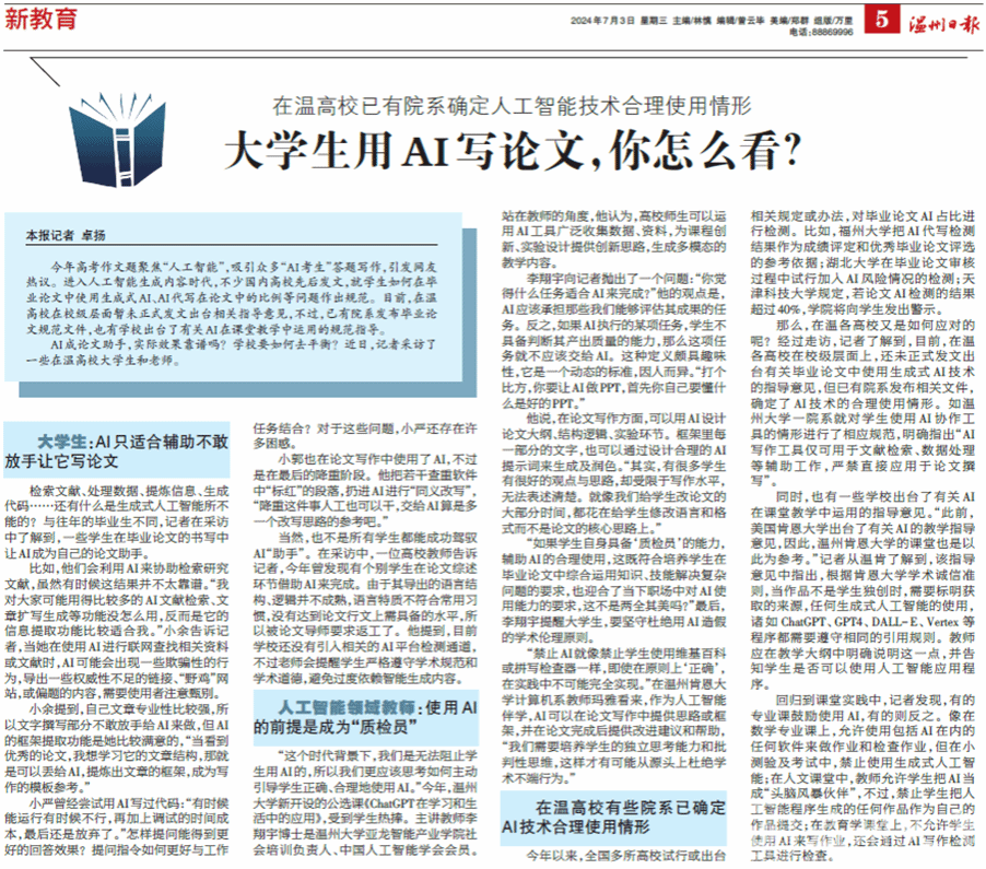 今年高考作文题聚焦“人工智能”,吸引众多“AI考生”答题写作,引发网友热议。进入人工智能生成内容时代,不少国内高校先后发文,就员工如何在毕业论文中使用生成式AI、AI代写在论文中的比例等问题作出规范。目前,在温高校在校级层面暂未正式发文出台相关指导意见,不过,已有院系发布毕业论文规范文件,也有学校出台了有关AI在课堂教学中运用的规范指导。