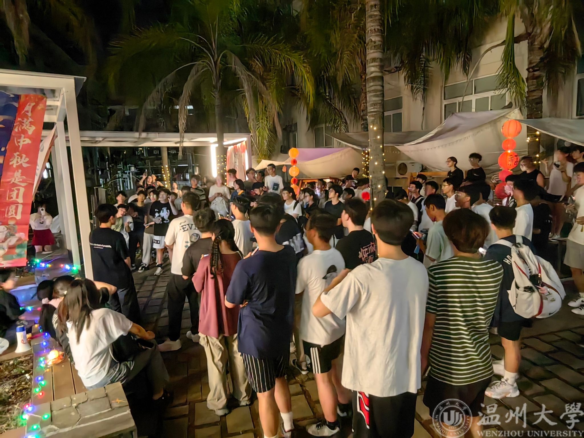 晚会现场布置得既传统又不失现代感,一盏盏精心制作的花灯璀璨夺目,挂布上绘制的传统图案与月光交相辉映,而各式月饼的香气更是弥漫在整个空间,营造出一片浓浓的节日景象。活动不仅设置了做花灯、猜灯谜等传统互动环节,还特别引入了制作漆扇与投壶等古代雅趣,让学子们在动手实践中近距离感受传统文化的魅力。