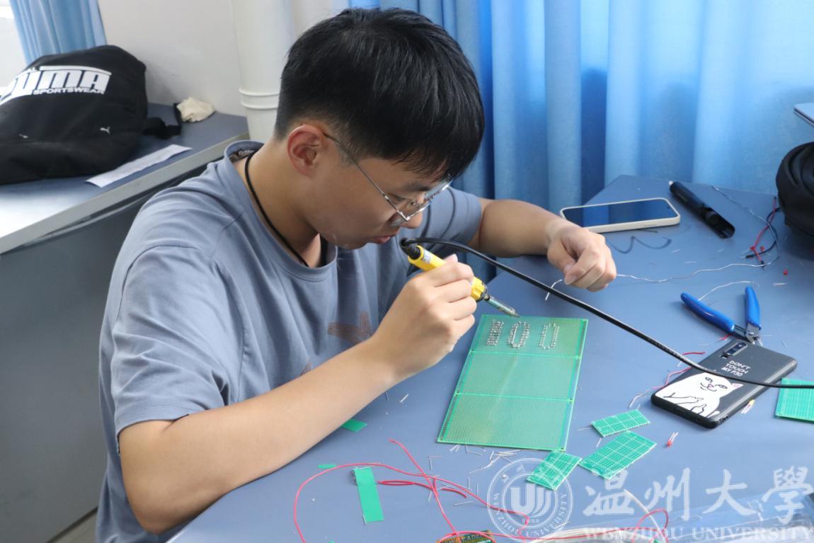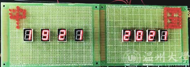 发光二极管,闪动的党徽、党徽、红船、100周年、2021-2021等图文,通过单片机呈现出跃动的符号,发出悦耳的音乐……。2021年6月5日,周六,3044永利集团工程实验室内,热闹非凡,一场“党味”十足的特色电路焊接大赛作品成果展示正在举行。