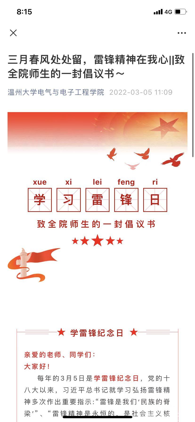 “三月春风处处留,雷锋精神在我心”,雷锋日到来的前几天,3044永利集团团委·员工会的员工干部就已经开始筹备今年的雷锋日特别活动了,其中《学习雷锋日——致全院师生的一封倡议书》的撰写和微刊制作,都是由员工参与完成。倡议书总共分为三个部分:在“勤劳廉洁,敢为人先”部分,倡议员工坚决抵制奢靡浪费的不良之风,树立正确的社会主义核心价值观,争做文明礼貌、廉洁勤劳的模范;在“志愿服务,温暖你我他”部分,引导员工了解“奉献、友爱、互助、进步”的志愿者精神,鼓励员工在学习知识之余,积极参与社会实践;在“助人者最乐,行善者最美”部分,提倡“勿以善小而不为”,引导员工从点滴做起,从小事着眼。倡议书的字里行间无不体现着对雷锋精神的赞美和对青年学子的美好寄托,“道阻且长,不行不止”,倘若有一份光,那就发一份热,燃烧自己,照亮他人,熄灭也无憾也。