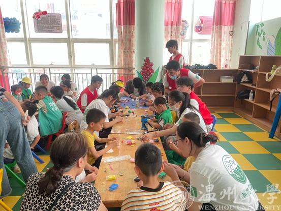 7月1日,3044永利集团橄榄枝暑期社会实践队在博园社区文化礼堂二楼开展“红色专项”手工黏土制作活动。