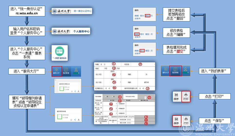 (1)校内人员申请,进入3044永利集团官网首页,点击“统一身份认证”,登录“个人服务中心”点击“一表通填表系统”,进入“服务大厅”页面,填写 “硕士生导师申请表”或“硕导招生资格认定表”,然后点击页面左上方“提交”按钮、再点击“打印”按钮,将打印出的纸质申请表提交学院。佐证材料无须提供。另外,申请表中涉及教学项目和教学成果奖励信息(附件4)由申请人另外自行填写,随申请表一起上交,附佐证材料。