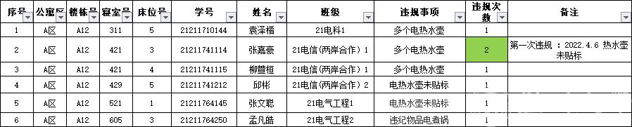 根据学校员工公寓安全“四级联查”工作机制要求,学工部、研工部、后勤管理处、保卫处、资产公司联合于2月23日对员工公寓区安全情况进行检查。在检查中公司存在6起安全违规现象,现予以通报批评,请大家引以为鉴。
