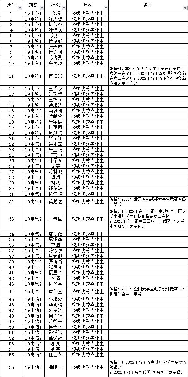 根据《3044永利集团优秀毕业生评选办法》(温大行政发[2020]104号),按照学校初次分配名额,根据前期进行2023届校级优秀毕业生的预评选,推荐 19电科1 余琦 等56名同学获得校级优秀毕业生荣誉称号,现将名单进行公示。