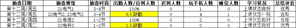 2023年5月8日至5月12日,学院学纪就业部对本院5个班次员工上课情况进行抽查。抽查情况反映如下: