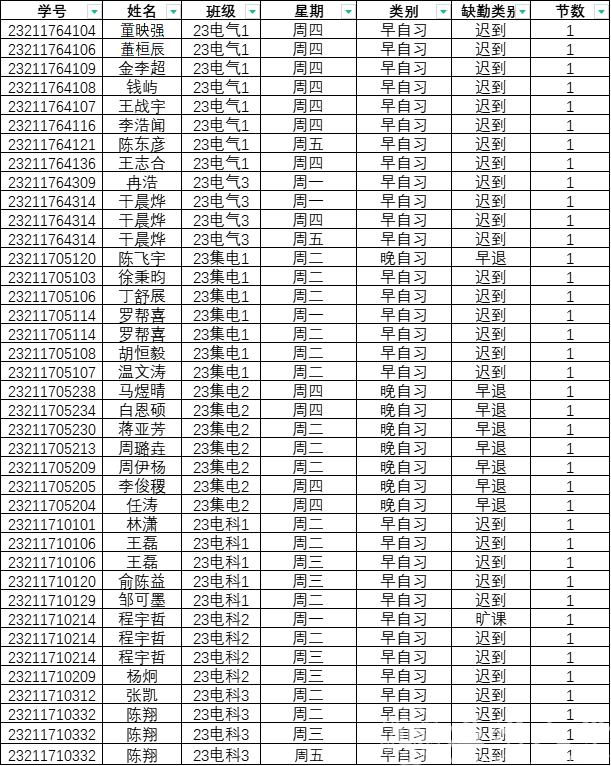 2023级上周早晚自习缺勤情况如下: