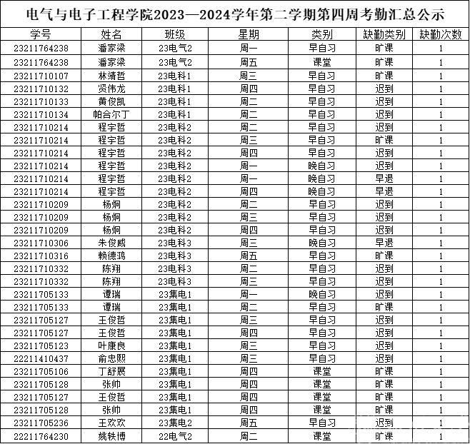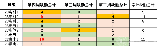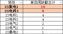 第四周早晚自习缺勤及课堂出勤情况如下: